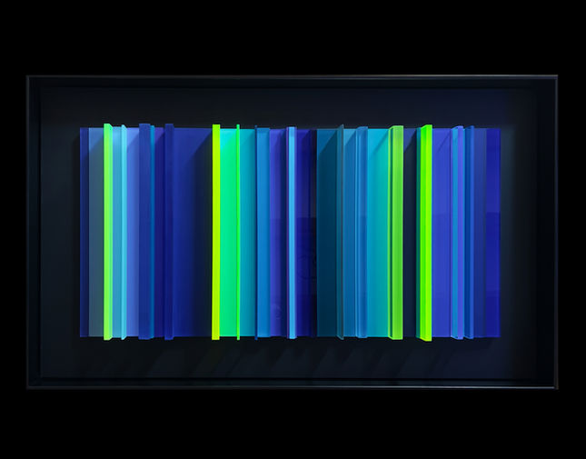 In opus 4 I have chosen different colors of blue and the contrasting color fluor green. The making of each artwork from the series '3D Verticals' is a complex and time-consuming process. Every single acrylic rod has to be laser cutted, sanded, and polished before fixing on the background (which is also acrylic).