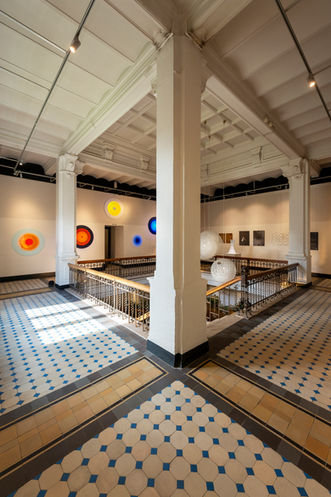 In the colorful series 'Interferences' several layers of laser engraved fluorescent acrylics are placed in front of each other. Each individual circle has a different circular wave pattern, starting from the center of the circle.