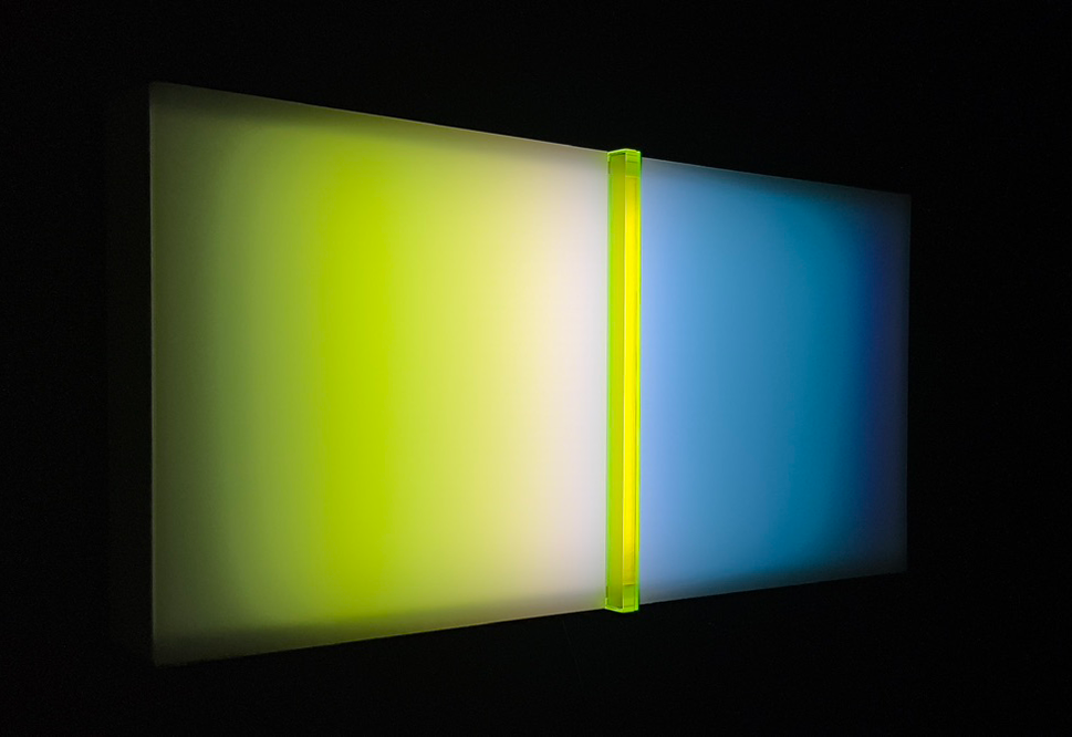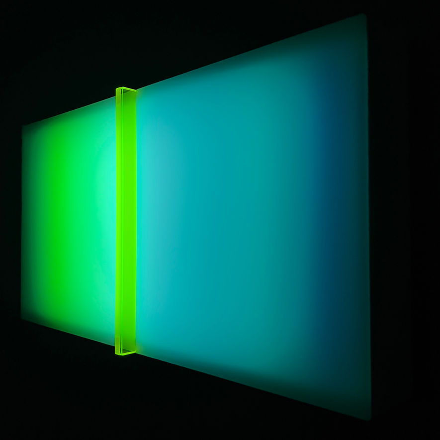 In this artwork several layers of colored photographic filters are combined with white satin acrylic sheets.