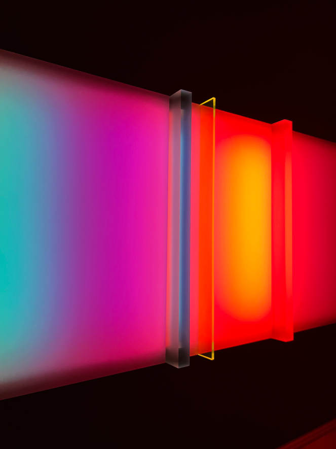 In this artwork several layers of colored photographic filters are combined with white satin acrylic sheets.